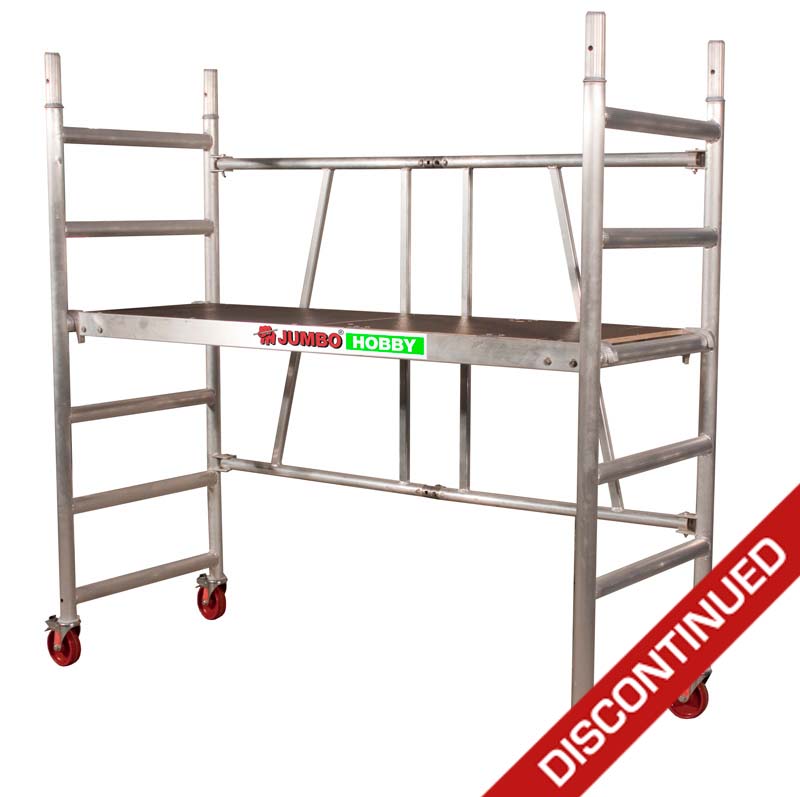 JUMBO DIY base scaffolding in aluminum. Comes complete with platforms and Ø125mm wheels with brakes. Small, practical scaffolding for smaller tasks in the home and garden. The scaffolding can be used as it is, as a small folding scaffolding, or it can be extended at the height of the associated extension axes. Is not compatible with JUMBO Proff scaffolding.